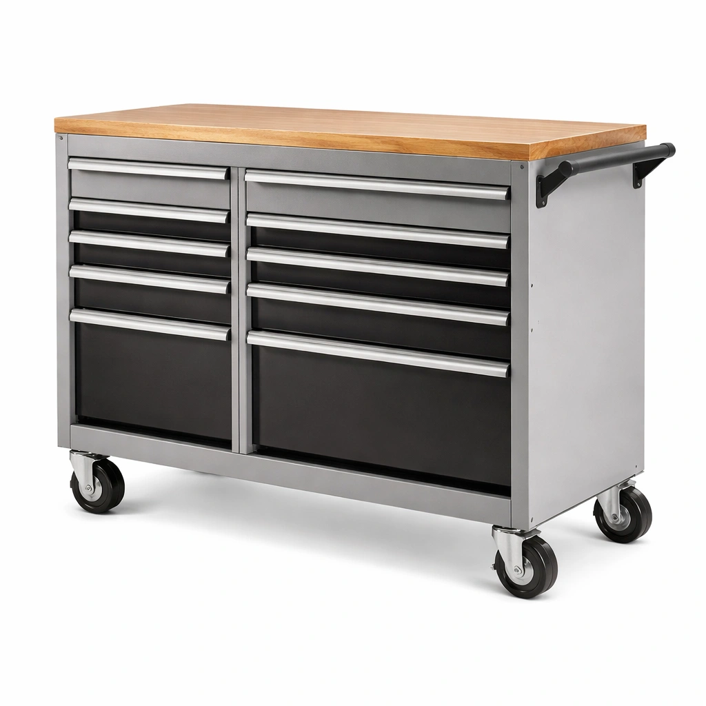 Carro de herramientas de metal con superficie de roble y 10 cajones