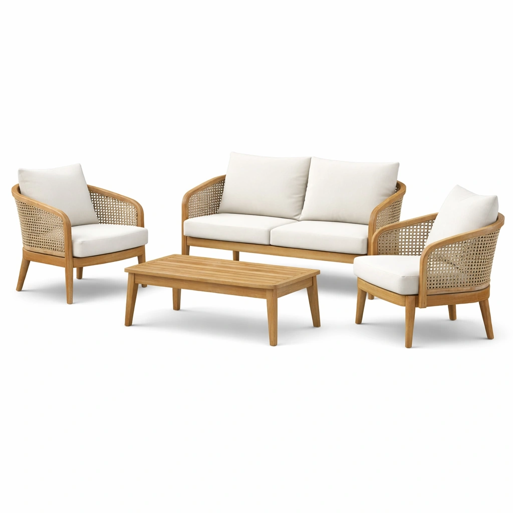 Conjunto de muebles de jardín de madera para exterior con cojines crema
