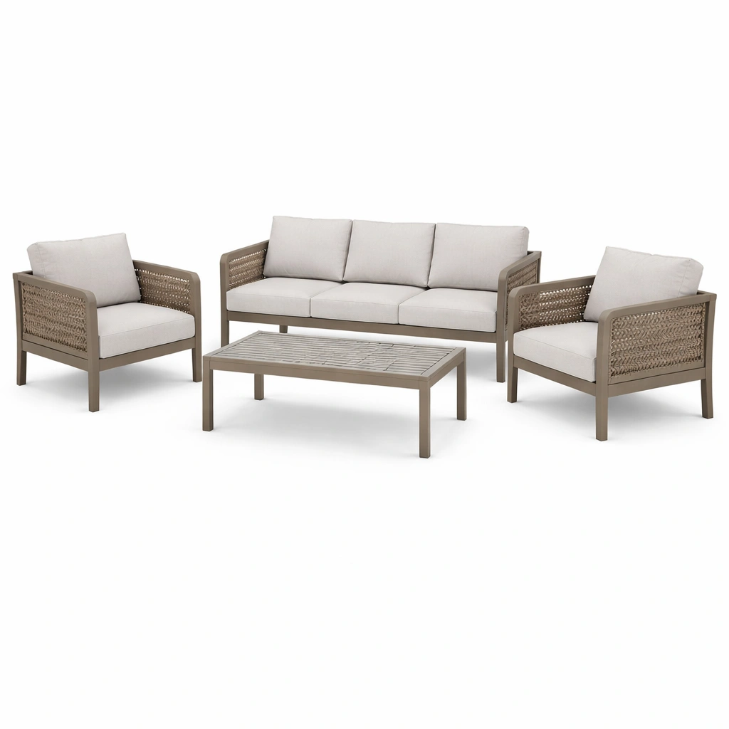 Materiales: Estructura de aluminio, ratán sintético, cojines de tela de poliéster.