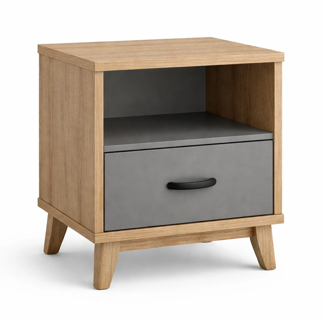 Material: Estructura de madera chapada en roble y frontal del cajón en MDF con acabado gris.
