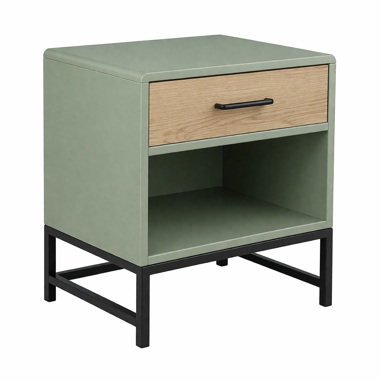 La mesa de noche presenta un diseño moderno y funcional, con un cuerpo de madera MDF acabado en verde. El cajón tiene un acabado en roble, añadiendo un atractivo contraste. La estructura es de metal, asegurando estabilidad.